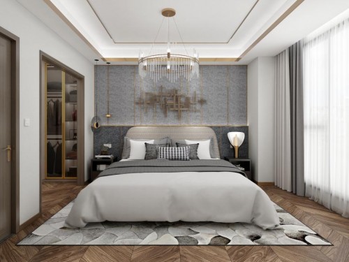 卧室空间色调以高级灰为主,演绎出极致优雅的轻奢贵气,同时辅以金属色、白色系家具点缀,搭配温馨典雅的床品,舒适自在!现代时尚的水晶灯,更将轻奢元素与美学意境相糅合,构建出最浪漫、高级的卧室环境,为家注入高级精致感。