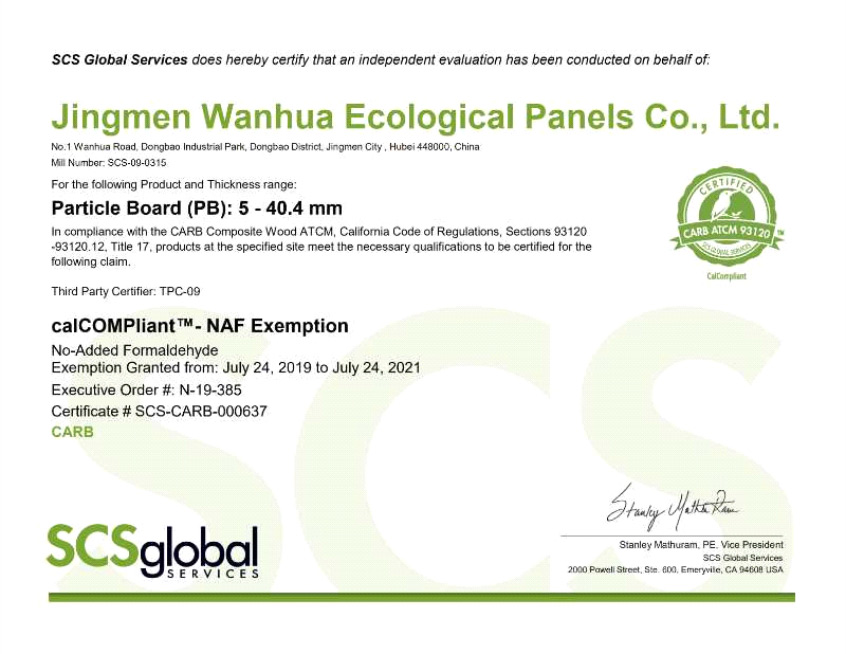 FORMALDEHYDE EMISSION IS FAR BELOW THE NATIONAL STANDARD NAF ALDEHYDE FREE EXEMPTION CERTIFICATION